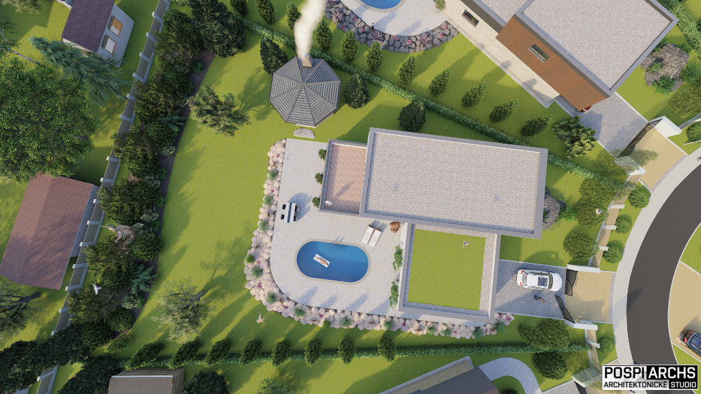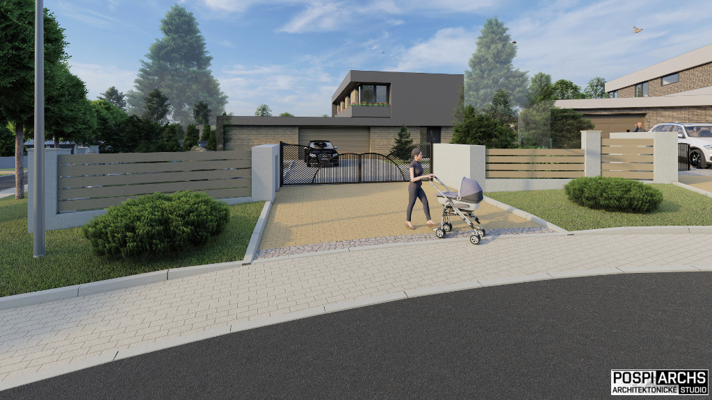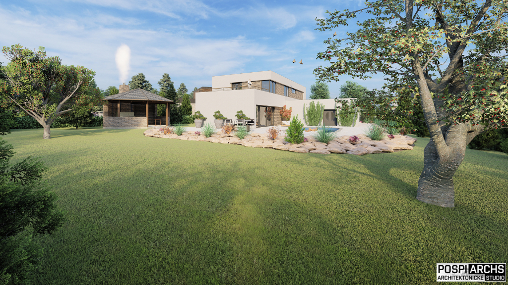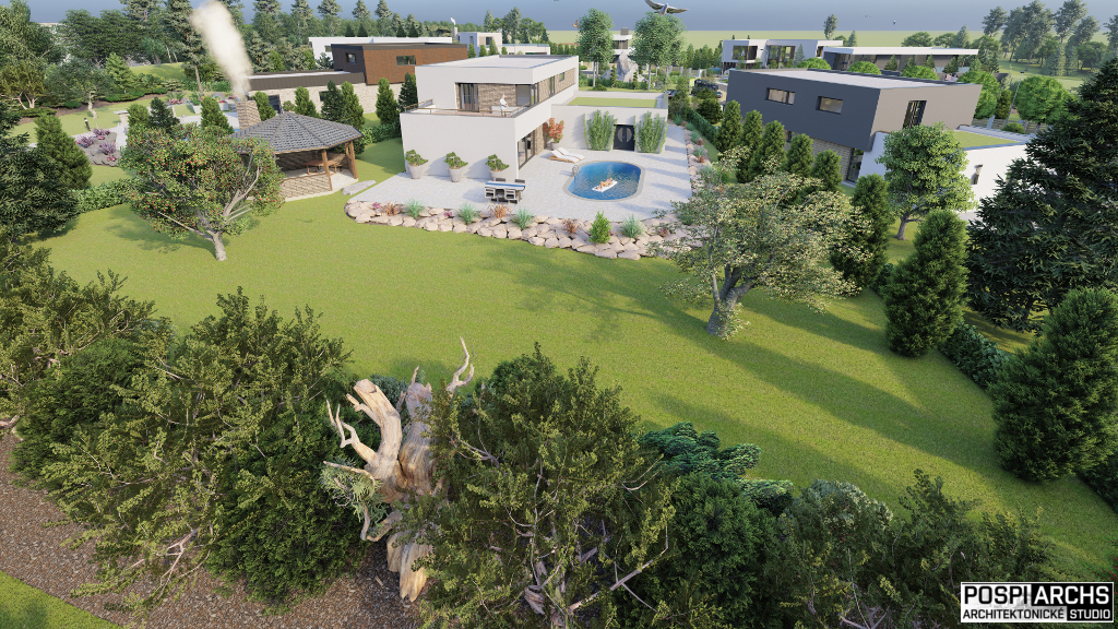 Návrh vizualizace celé rezidenční čtvrti „Nad Skalkou“ v Havlíčkově Brodě. Názorná vizualizace rodinného domu „1“ a zahrady.