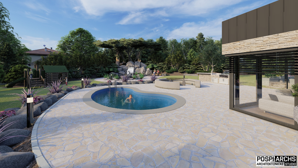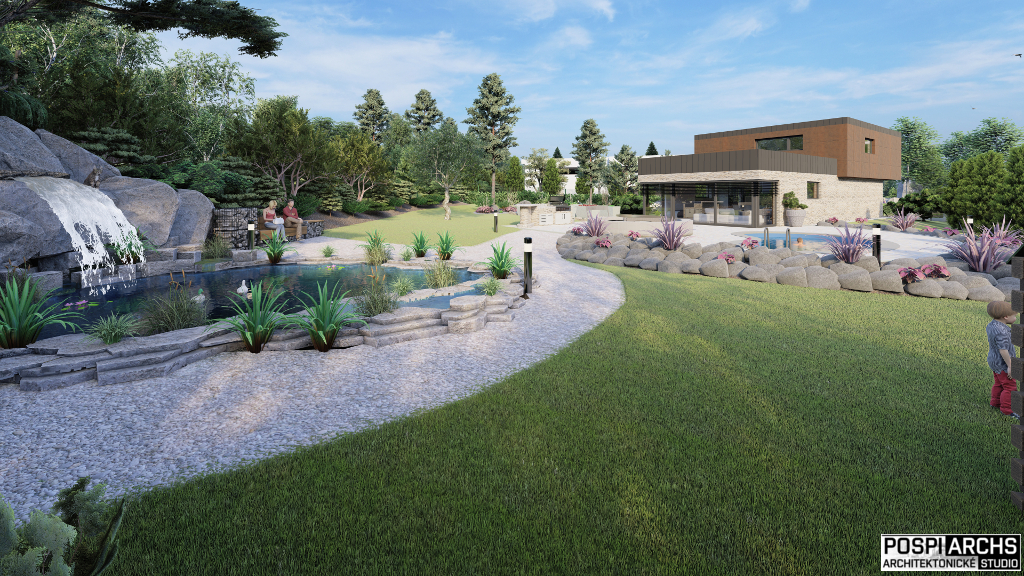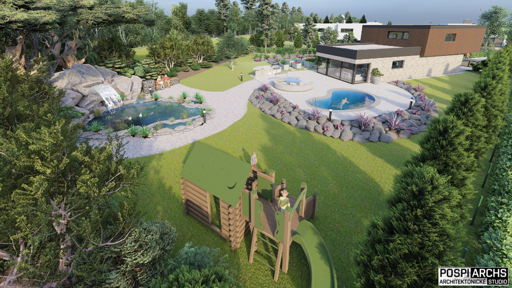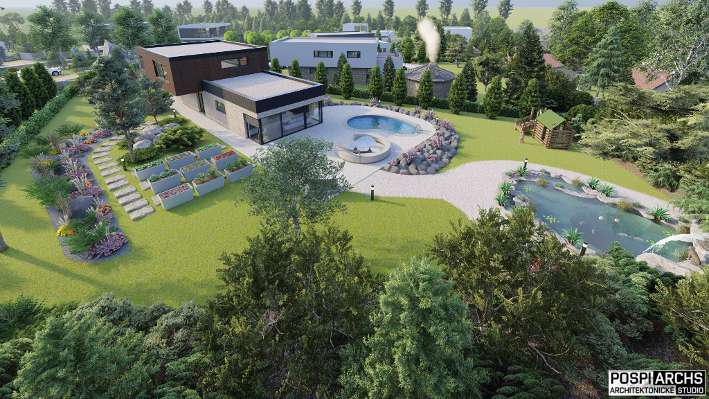 Návrh vizualizace celé rezidenční čtvrti „Nad Skalkou“ v Havlíčkově Brodě. Názorná vizualizace rodinného domu „3“ a zahrady.