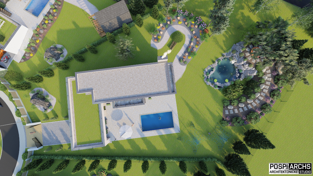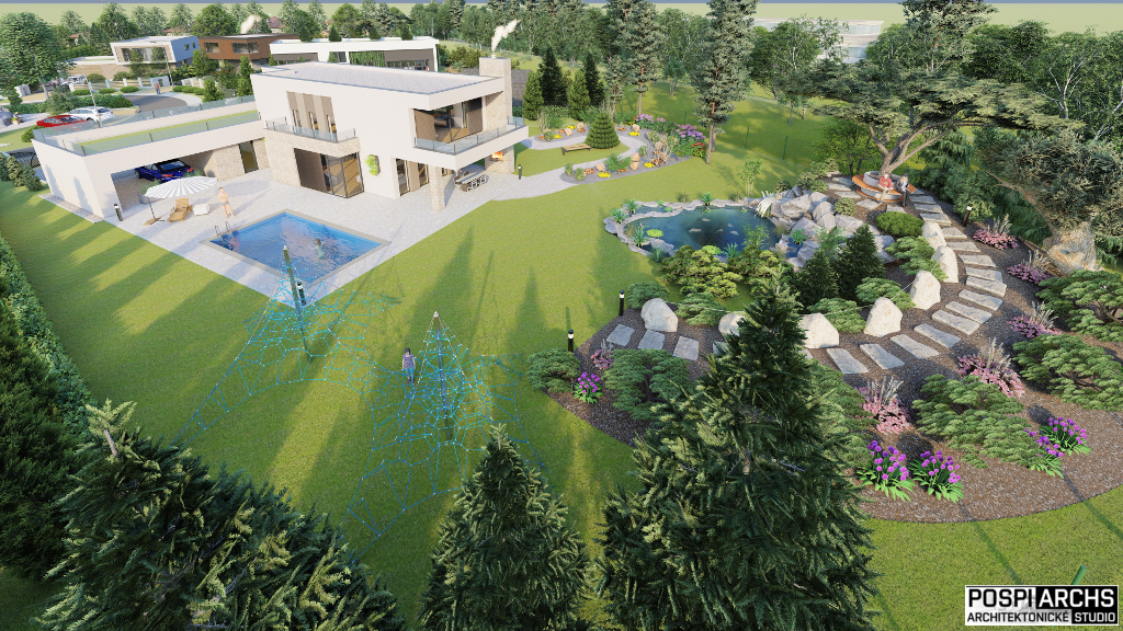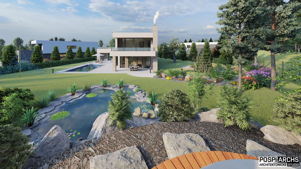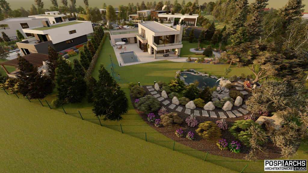 Návrh vizualizace celé rezidenční čtvrti „Nad Skalkou“ v Havlíčkově Brodě. Názorná vizualizace rodinného domu „5“ a zahrady.