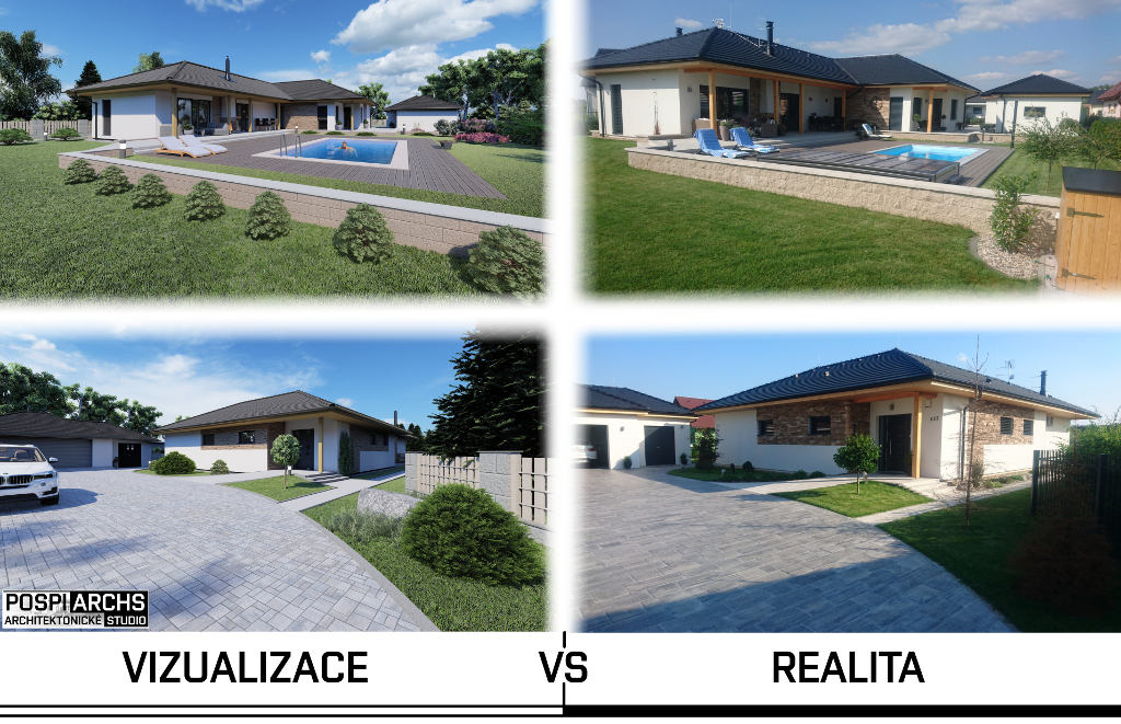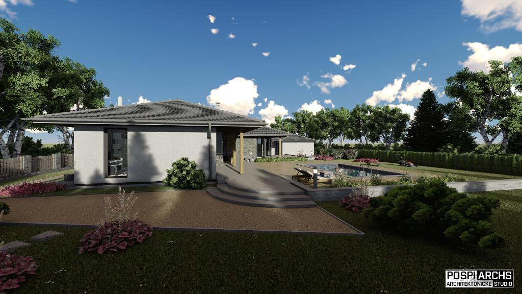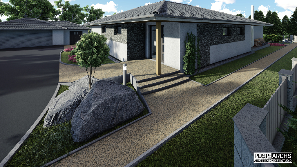 Návrh rodinného domu typu „bungalov“ do nově rozparcelované okrajové části obce. Novostavba je momentálně v procesu výstavby.