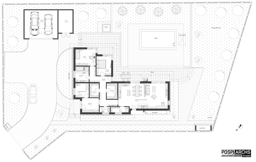 Hlavní myšlenkou bylo uzavřít jižní část parcely a oddělit od okolní zástavby, kde je po jižním okraji osazená zeleň a hlavní uliční část odděluje rodinný dům, tím se nám vytvoří uzavřená klidová zóna zahrady. Dispozice je v rozsahu 3 obytné místnosti + kuchyňský kout. Obytné místnosti jsou řešeny jako ložnice, dětský pokoj a obývací pokoj. Všechny jsou situovány směrem do uzavřené klidové části parcely směrem na jižní stranu pozemku. Ložnice a dětský pokoj mají větší prosklená rohová okna, pro pocitové propojení exteriéru a interiéru. Z okna je výhled do zelené části pozemku a bazénu.