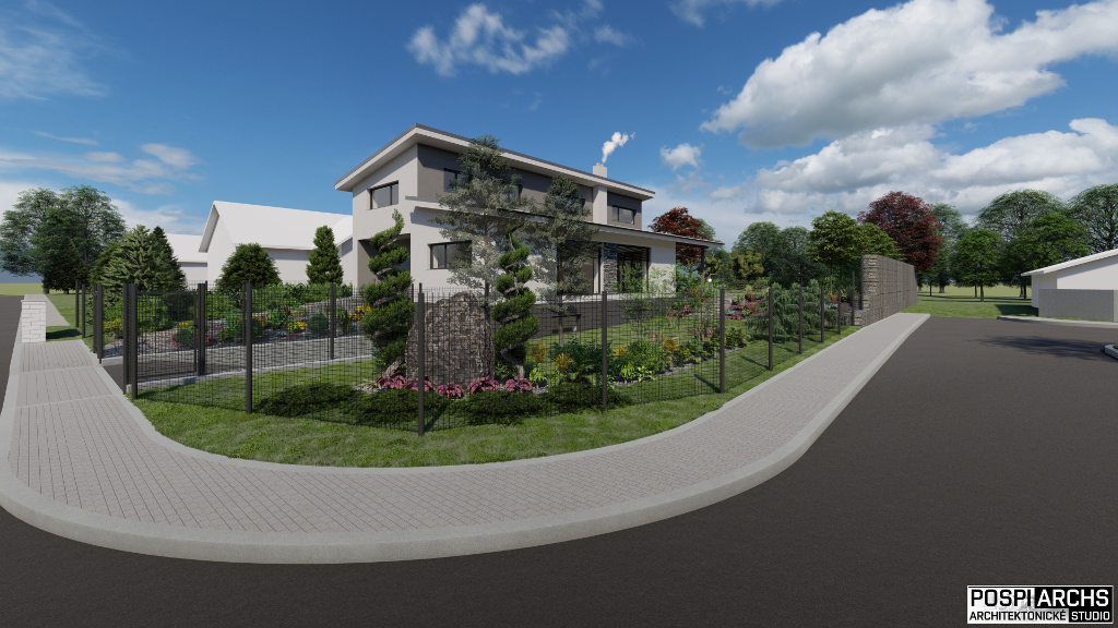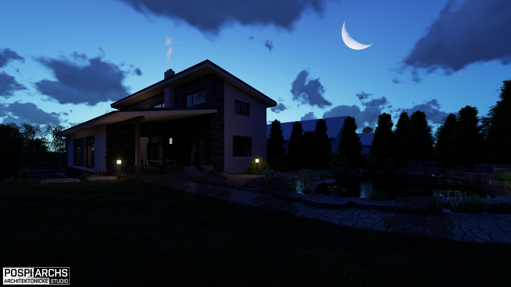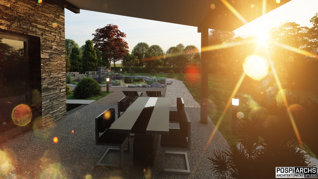 Řešení exteriéru a zahrady pro rodinný dům ve městě Přibyslav. Součásti vizualizace je venkovní terasa, jezírko a zahrádka. Fasáda je řešena světlé barvy v kombinaci s tmavým obkladem imitující kámen.
